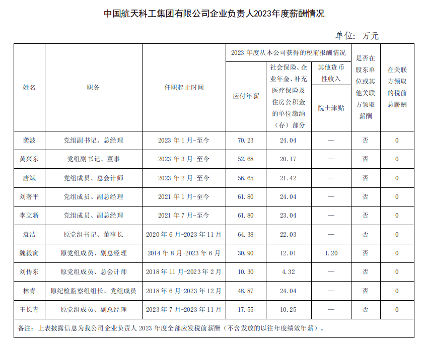 中國航天科工集團有限公司企業(yè)負(fù)責(zé)人2023年度薪酬情況